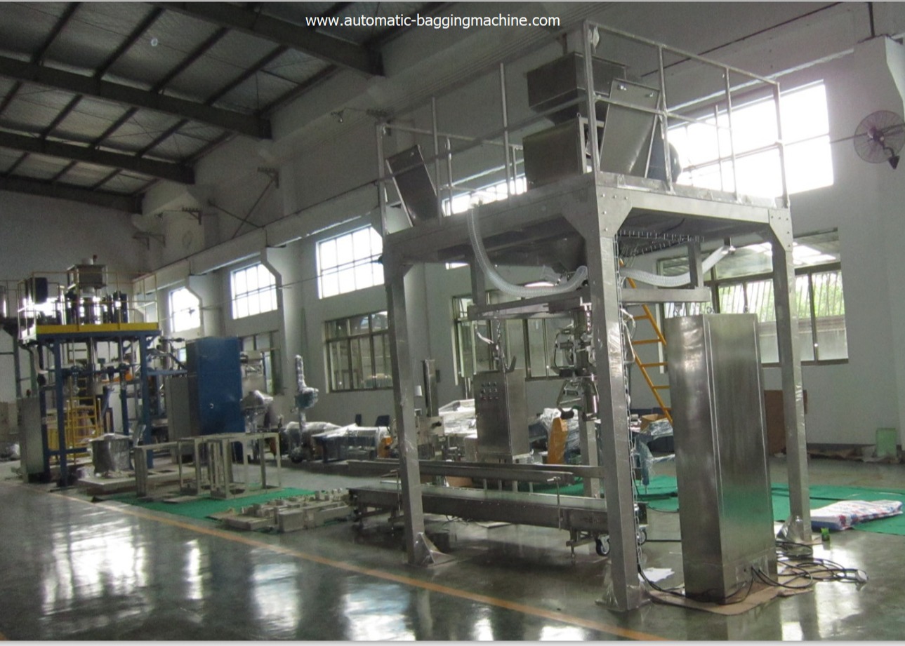 自動持ち上がるmaterials→Automatic重量を量る機械→自動袋の包装の単位(袋、ふち飾り袋、クランプ袋、開いた袋、空白の上の一突き) →Horizontal自動密封機械単位(自動運搬の密封袋、切れ目)の→の完成品の出力→の自動運搬